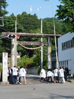 仲町の若衆が、合図により一気にお注連を立てます。不安定なお注連は息が合っている若衆でも非常に難しい。お注連立式を滞りなく終了し夏祭りの始まりです。