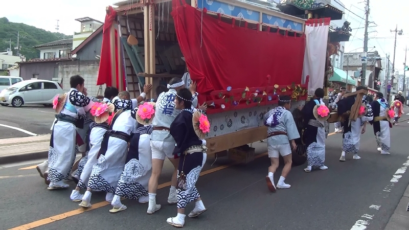 世話人を先頭に、練歩く様は圧巻です。 若衆頑張ってください。 これも重要な任務。 屋台の大きさ立派です。 坂道も若衆の力で上ります。